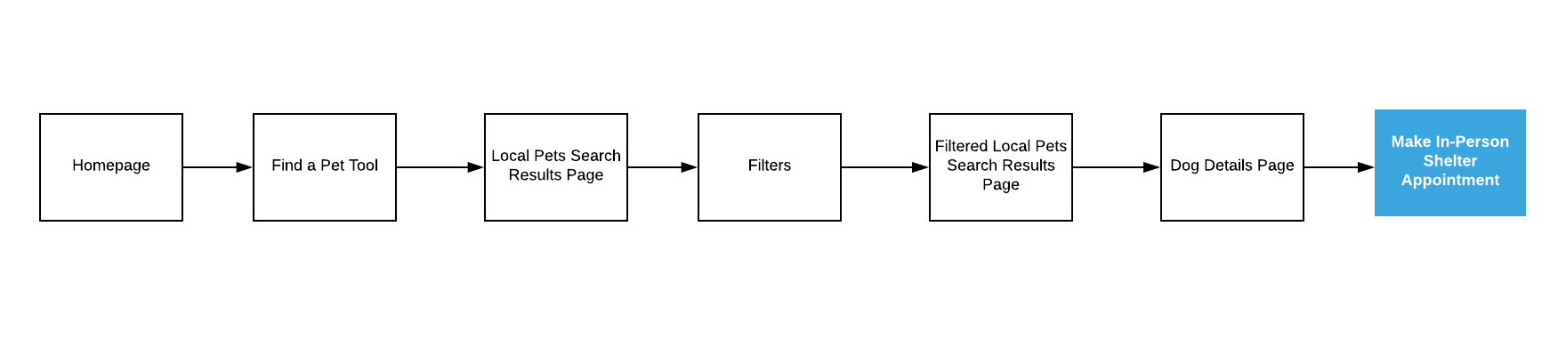 Next, I mapped out a simple task flow to visualize the core user task of searching for & viewing a pet profile, and then scheduling an appointment to visit that pet at a shelter. This quick visualization helped me determine which screens I would need to design out.