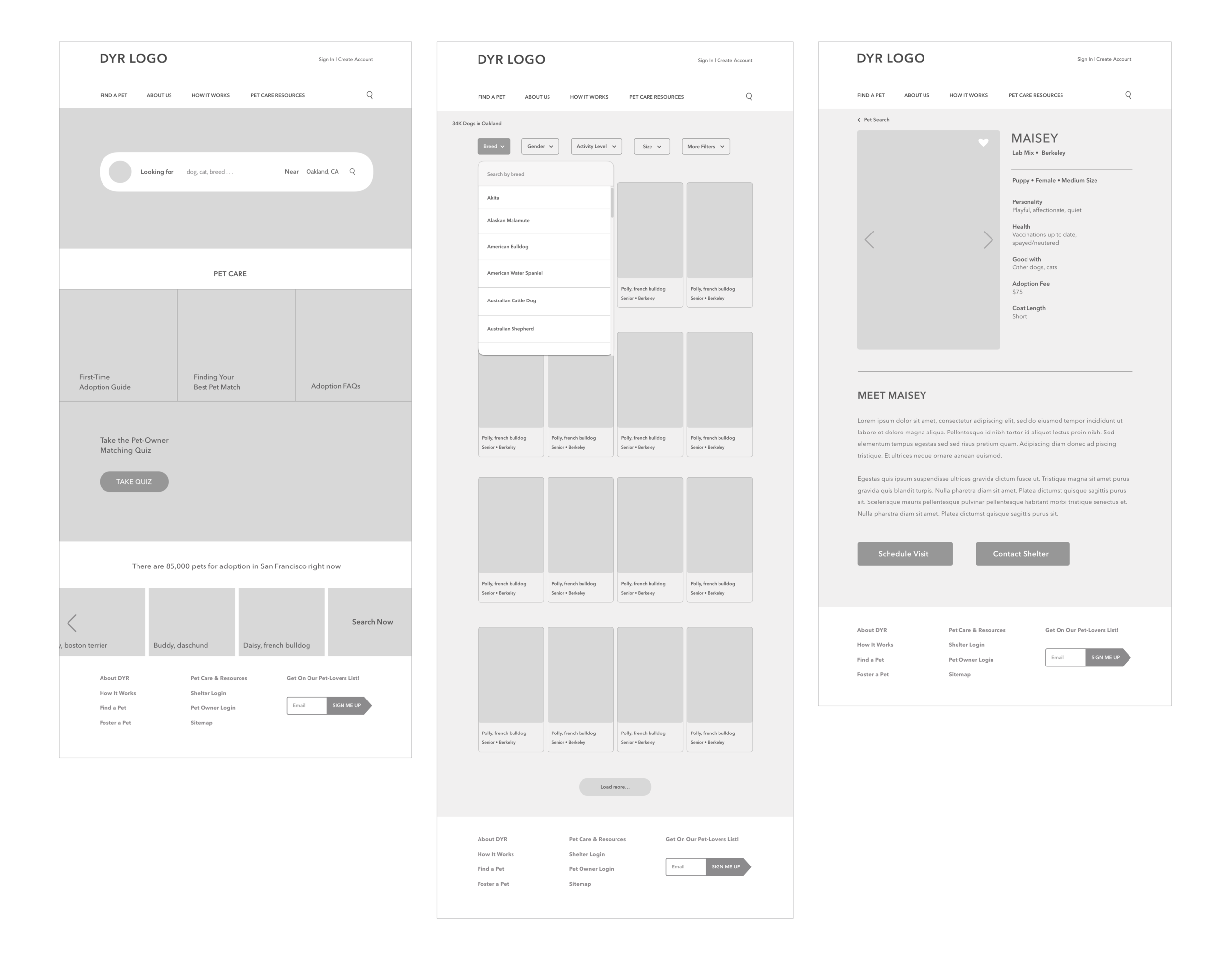 From the research, it was clear that the target demographic that wanted to adopt rescue animals preferred searching for pets online first to get access to a wide variety of pets and find information on each. These users also noted the importance of having a quick, convenient way to schedule an appointment with a shelter online so they could visit pets they liked in person.