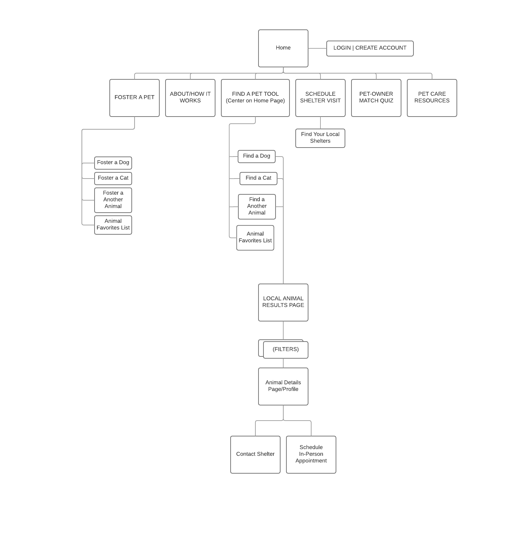 I created a sitemap based on the research findings from my surveys and interviews. The sitemap shows the top level navigation all the way down through the pet details page, as well as the shelter appointment booking system.