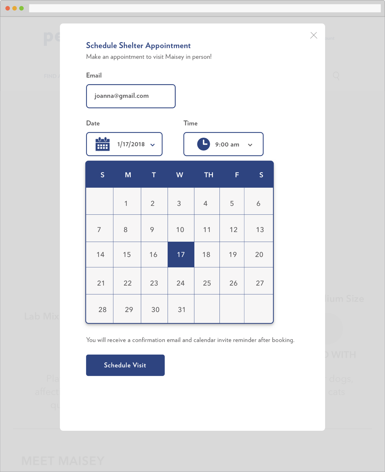 Allows user to select available date and time to schedule an in-person visit to the shelter.
